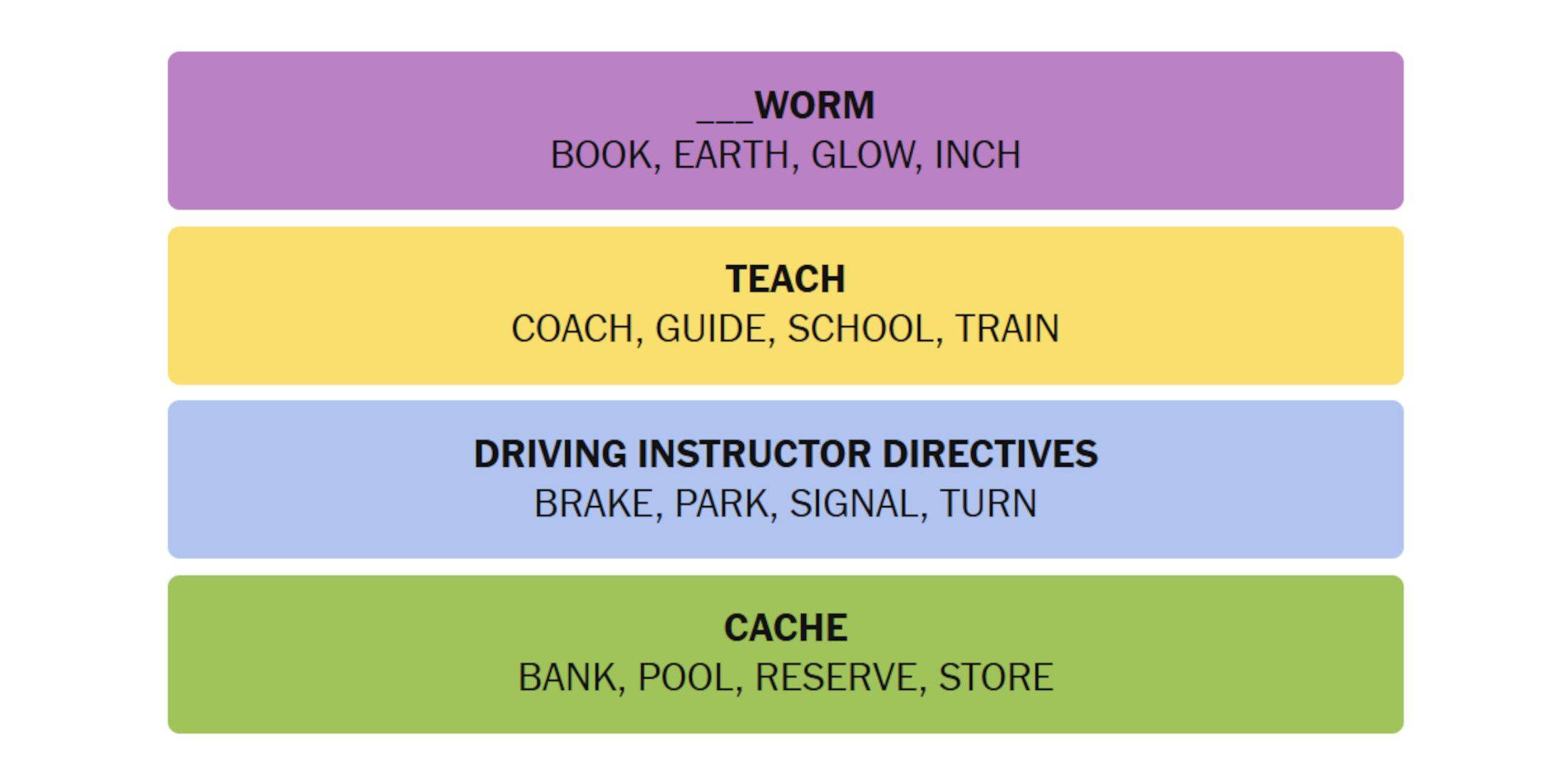 Aquí hay pistas para la categoría púrpura (la más complicada): Cada una de estas cuatro palabras puede ser seguida por el mismo nombre de animal de cuatro letras para formar frases comunes.